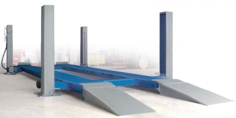 Подъёмник четырехстоечный электромеханический с гладкими платформами (для общеслесарных работ).