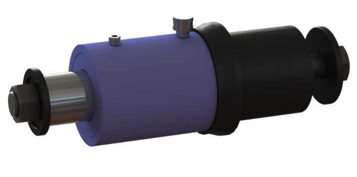 Гидроцилиндр одностороннего действия с двухсторонним полым штоком. Усилие 16т, ход штока 60мм, диаметр штока 45мм, внутр. отв. 25.