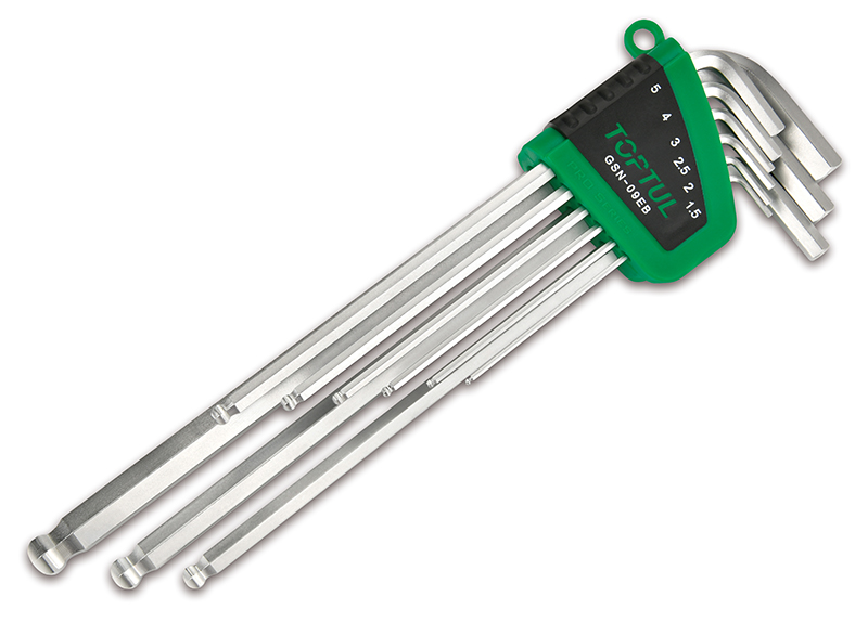 Приобрести Набор длинных Г-образных ключей HEX, 1,5-10 мм, 9 предметов TOPTUL GSN-09EB от компании Toptul (Тайвань) из раздела Шестигранные Г-образные ключи по цене 1 908 рублей.
