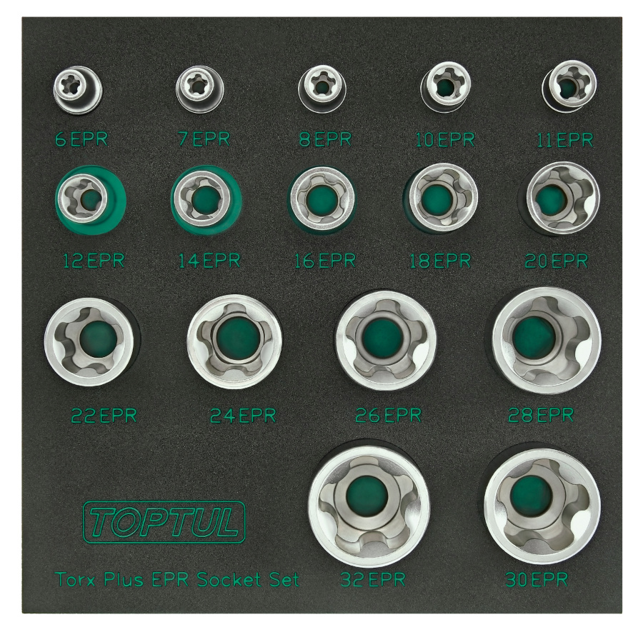 Набор торцевых головок TORX Plus EPR 1/4",3/8",1/2" 5-ти лучевые, 6EPR-32EPR, 16 пр. на ложементе TOPTUL GABF1601